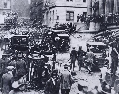 It was just after noon on this day in 1920 that a horse-drawn wagon, filled with dynamite and iron slugs, exploded in front of the JP Morgan building in NYC. 38 people are killed and over 400 injured. A couple days later a group calling themselves the “American Anarchist Fighters” claimed responsibility, but despite a three-year long investigation no arrests were ever made.